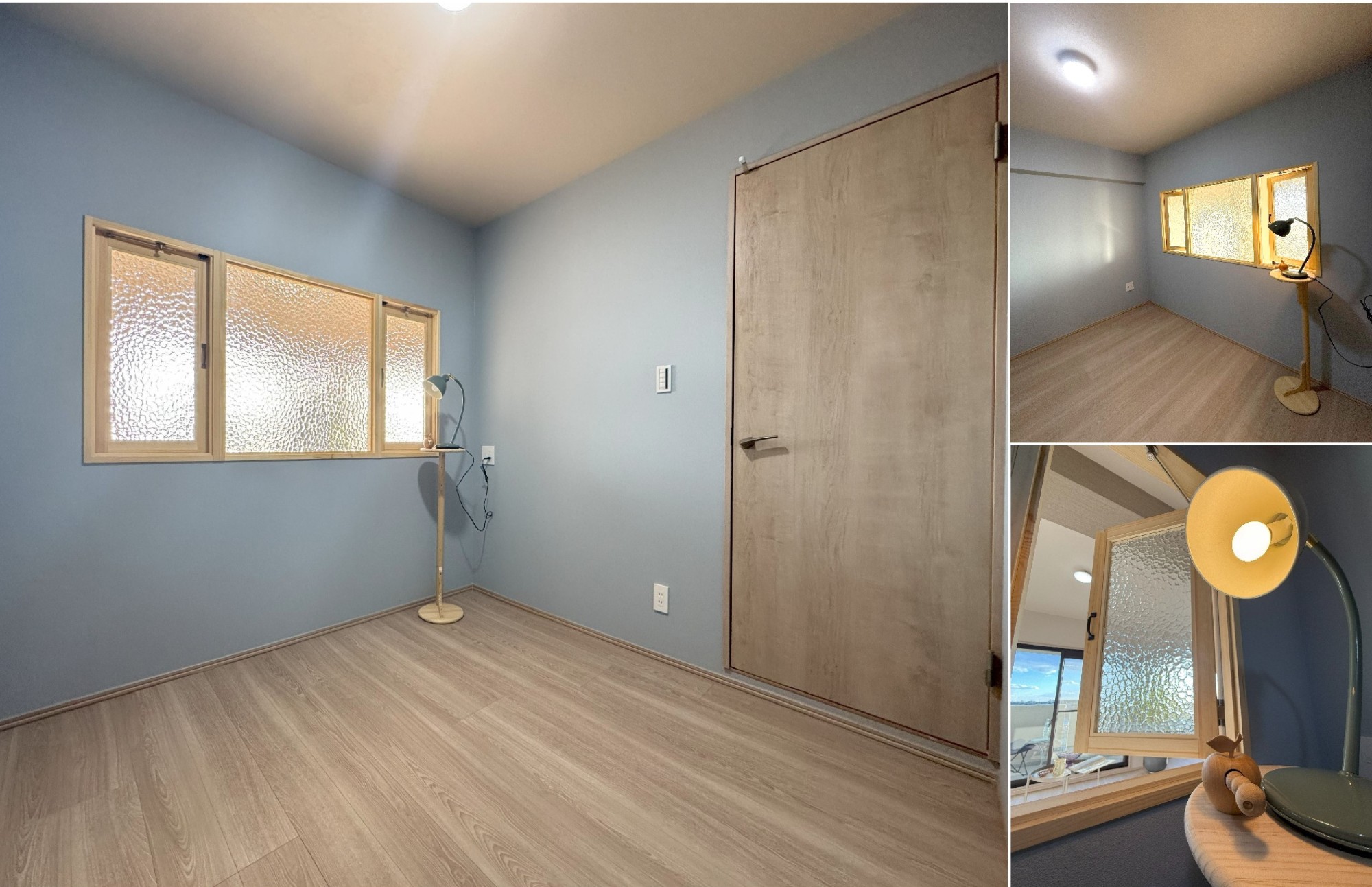 リビング隣の洋室は優しい水色の壁クロスで気分を変えてみました。