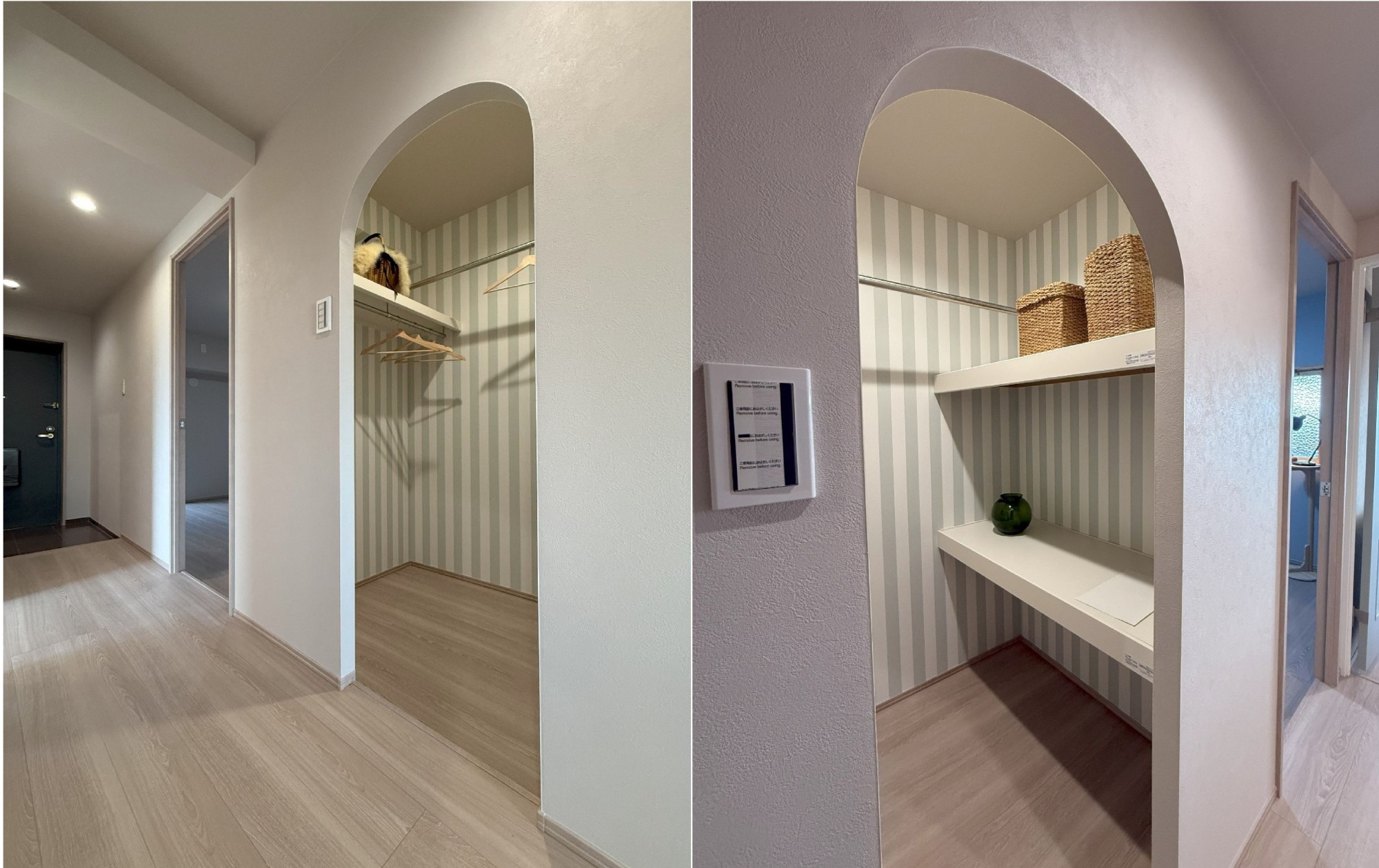 洗面台の丸い鏡とファミリークローゼットの出入り口のアーチが可愛いを際立たせるポイントになっています。
